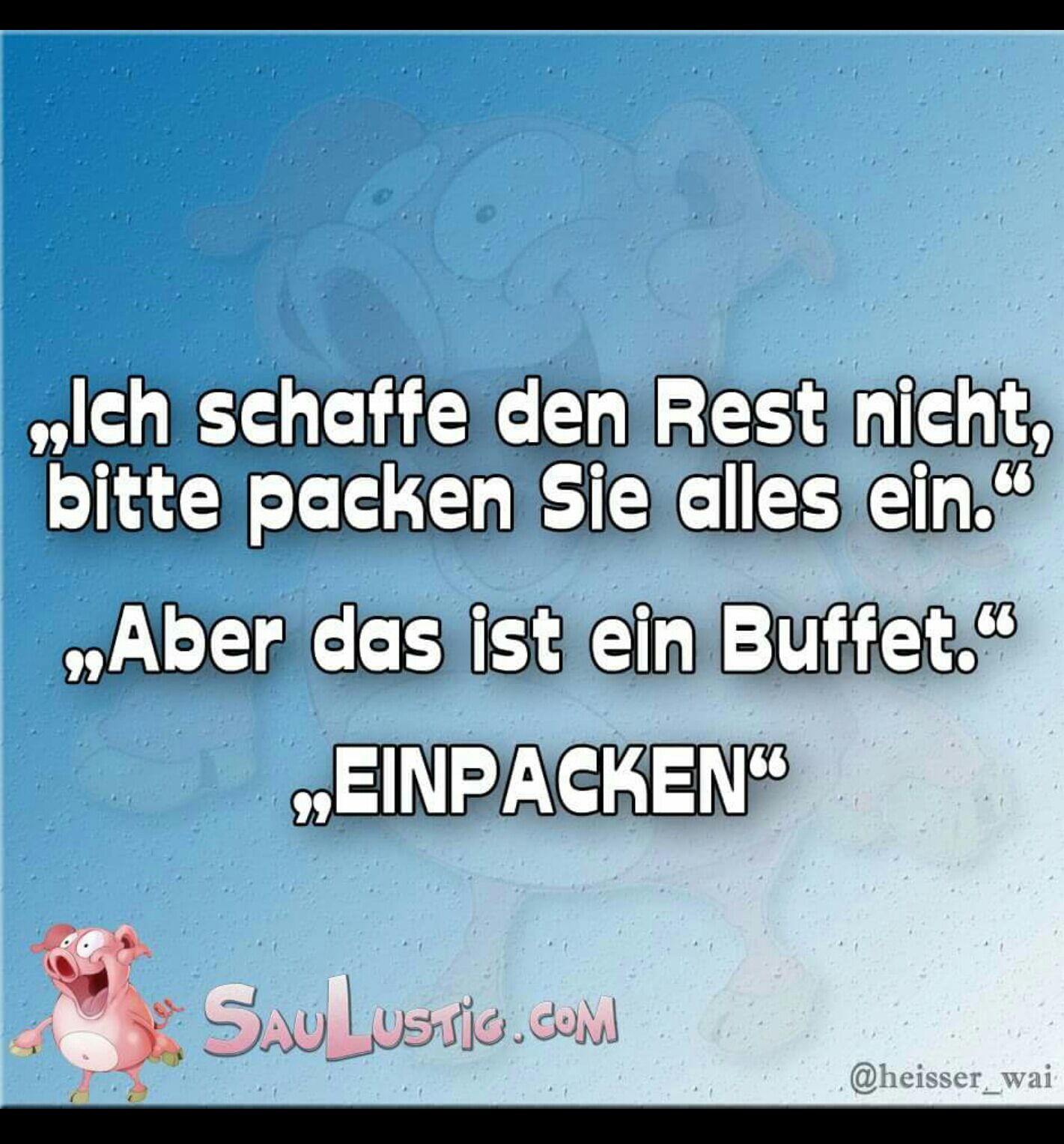 Ein Bauarbeiter war im 3. Stock eines Rohbaus. Er benötigte dringend eine Säge, war aber zu faul um sie von unten zu holen. Also rief er seinem Kollegen am Boden zu, was er brauchte. Der konnte aber kein Wort verstehen. Also versuchte der Bauarbeiter dem Kollegen mittels Zeichen zu erklären, was er brauchte. Zuerst zeigte er auf seinen Kopf (für "ich"), dann auf seinen Bauch (für "brauche") und dann machte er mit der Hand die typische Sägebewegung.