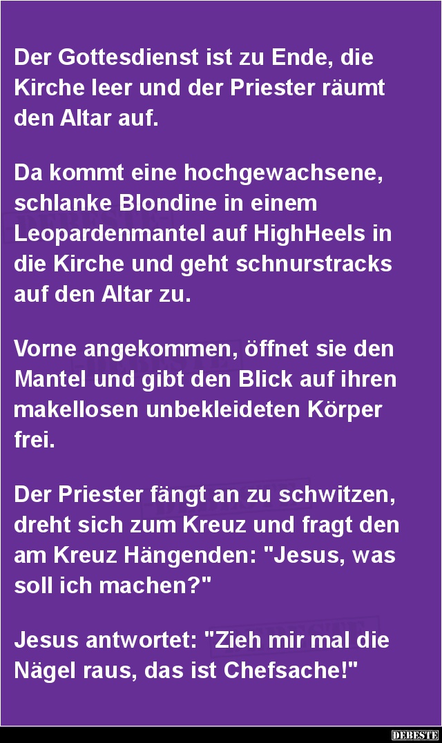 Die Frau von Bauer Franz stirbt. Am Tag vor dem Begräbnis trifft er sich mit dem Pfarrer um ihn zu bitten bei der Grabesrede auch zu erwähnen wie sehr er unter ihr leiden hat müssen, da sie keine Gelegenheit ausgelassen hat, ihm eins auf die Rübe zu geben. Dem Pfarrer bereitet das natürlich Unbehagen und kann die Nacht kaum schlafen... Schließlich findet er eine Lösung für sein Problem und beginnt die Grabesrede mit: "Wir haben uns heute hier versammelt, weil ein Herz und zwei Hände aufgehört haben zu schlagen."