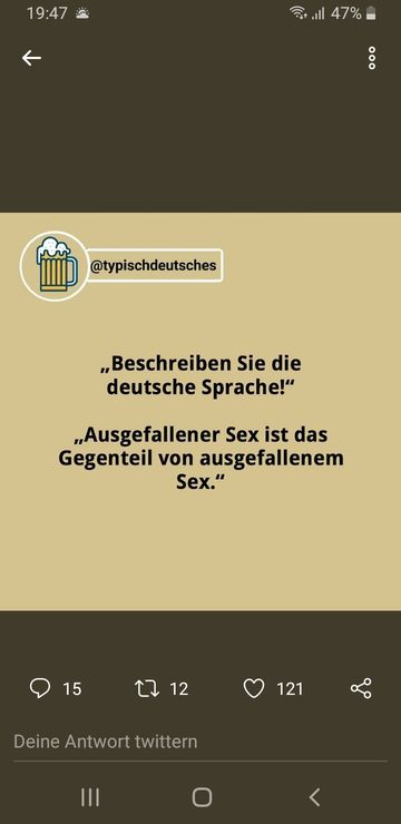 Geht einer in die Apotheke und legt sein Bestes Stück auf den Tresen und sagt zur Apothekerin, bitte ich brauch einen passenden Gummi für den Herren. Die Apothekerin lächelt und sagt, Lachgummi führen wir nicht.