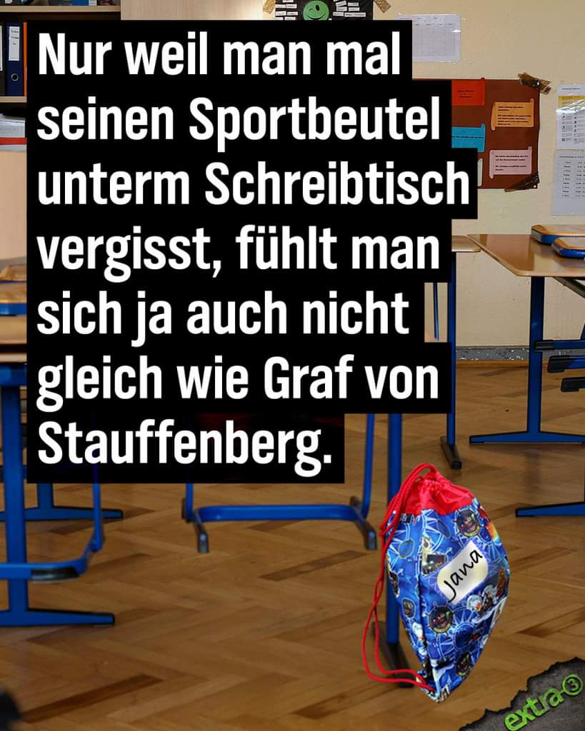 Nur weil man mal seinen Sportbeutel unterm Schreibtisch vergisst, fühlt man sich ja auch nicht gleich wie Graf von Stauffenberg.