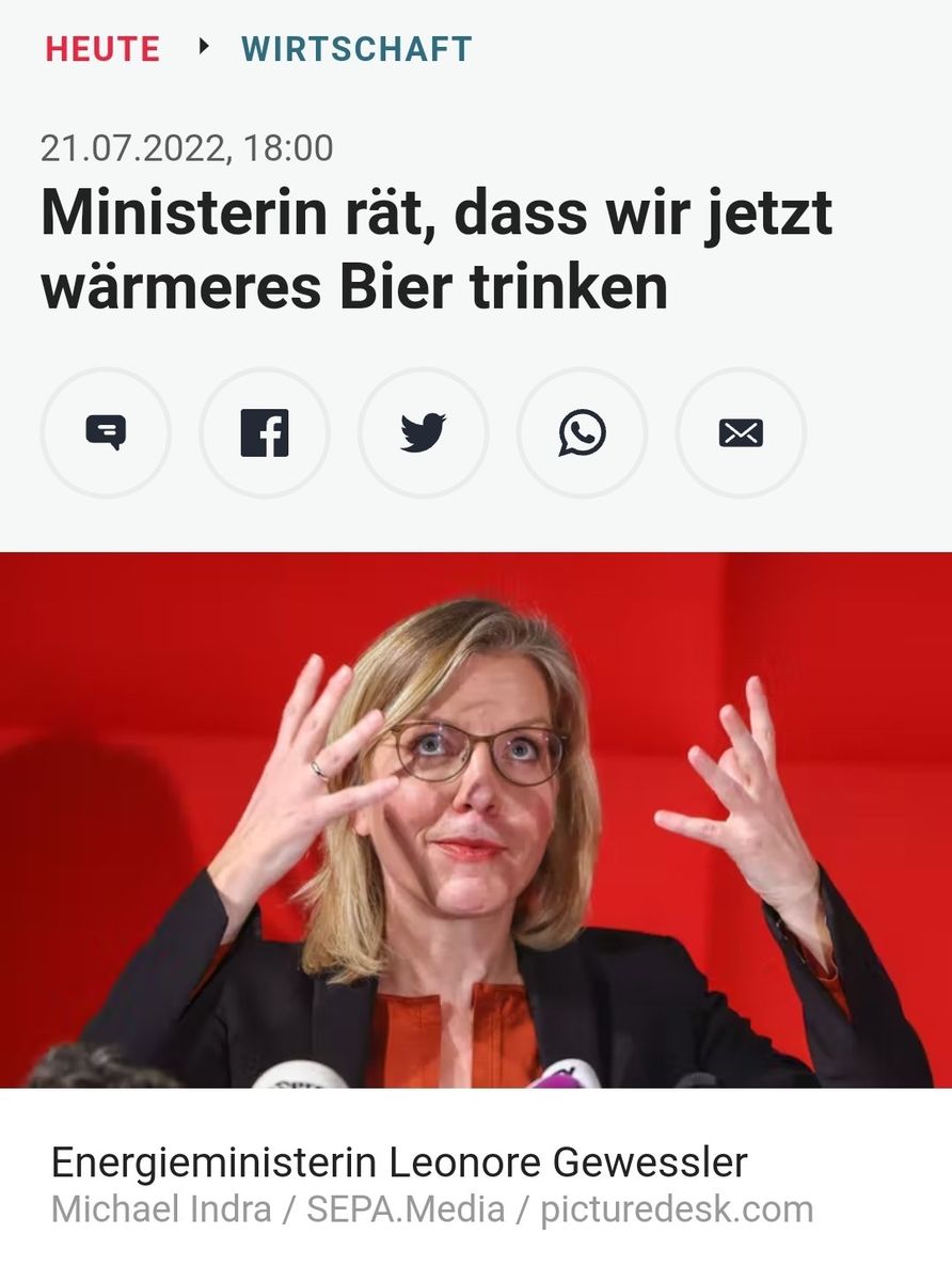 Sorry, aber diese Öko-Tante sitzt gemütlich im Büro, in dem es dank der funkelnagelneuen, nur 143.000 Euro teuren und bestimmt völlig CO 2- neutralen Klimaanlage bestimmt gut auszuhalten ist und gibt schwachsinnige Tipps, während sie sinnvolle Ideen (Tempo 100) abdreht, weil das die Neandertaler bei der ÖVP zu sehr aufwühlen könnte.