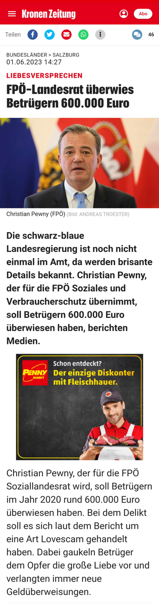 Ist auch nicht die Pointe. Die ist, dass er auf diesem Gebiet einschlägige Erfahrung gesammelt hat und seine Expertise als Betrugsopfer der neuen Salzburger Landesregierung in seiner künftigen Funktion als Landesrat auch für Verbraucherschutz zur Verfügung stellen wird.
