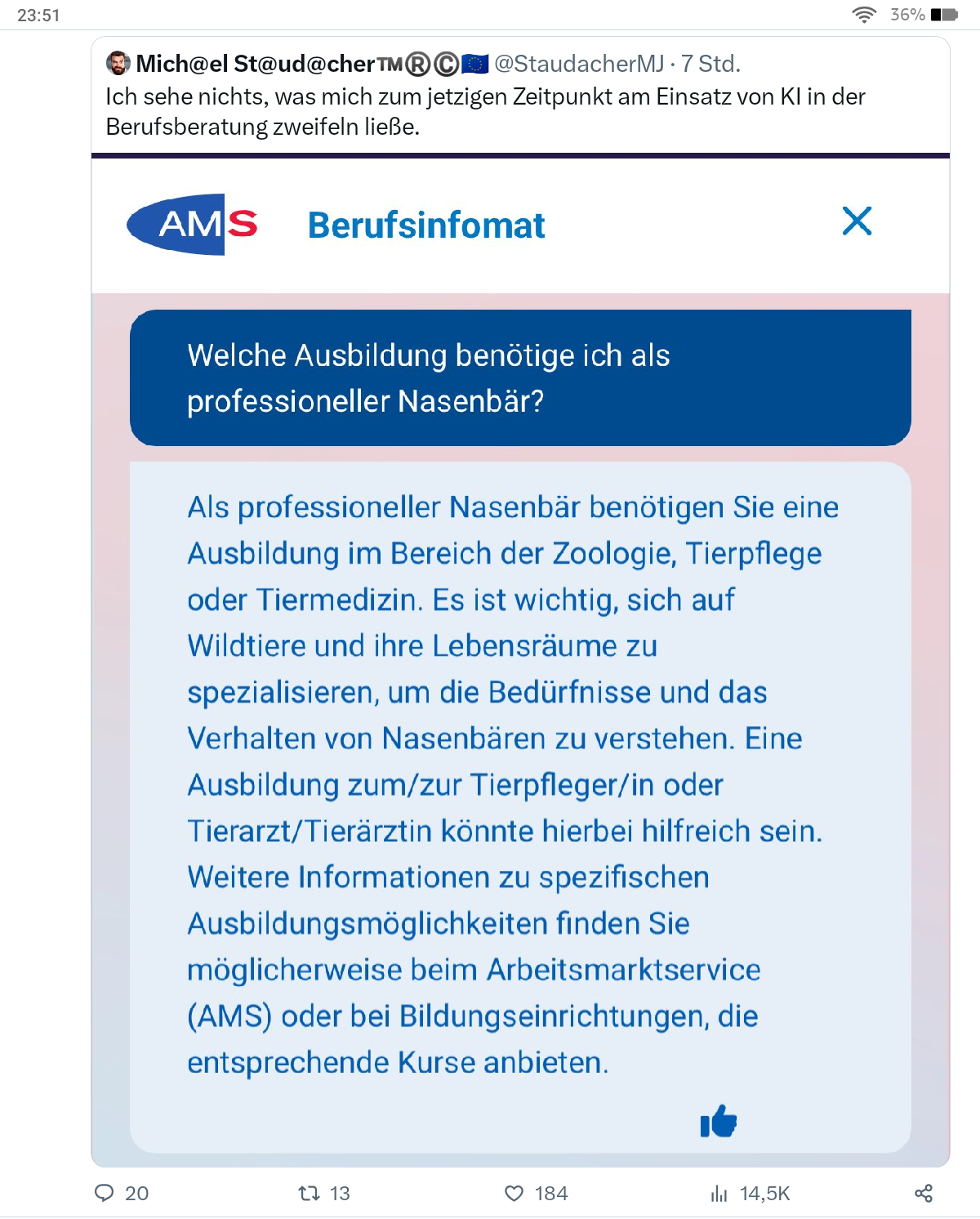 Der vom Leiter des Arbeitsmarktservice vor ein paar Tagen mit großem "Trara" vorgestellte 'Berufsinformat", eine zwecks Berufsberatung um 300.000 Euro geschaffene KI-Applikation, liefert von Anfang an beste Ergebnisse.