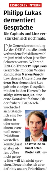 Der zweite Kandidat für das höchste Amt des heimischen Eishockeyverbandes heißt Markus Praschl. Der Unternehmer und stellvertretende Obmann der Junior Capitals war Vorstand der REWE-Group. Ins Spiel gebracht wird seine Kandidatur von Andreas Ösze, dem Präsidenten des Wiener Verbandes. Gerüchten zufolge soll in dieser Konstellation auch Dieter Kalt jun. eine Rolle spielen und eine Verbandsfunktion übernehmen. Mit dem Ex-KAC-Sportdirektor, dem ehemaligen ÖEHV-Entwicklungsleiter Gregor Baumgartner und U20-Co-Trainer Philipp Lukas haben bereits Sondierungsgespräche stattgefunden. Bei Vertretern von Landesverbände wird intensiv um Wahl-Unterstützung geworben. Praschl soll die Unterstützung der Vorarlberger und von zwei weiteren Landesverbänden sicher sein.