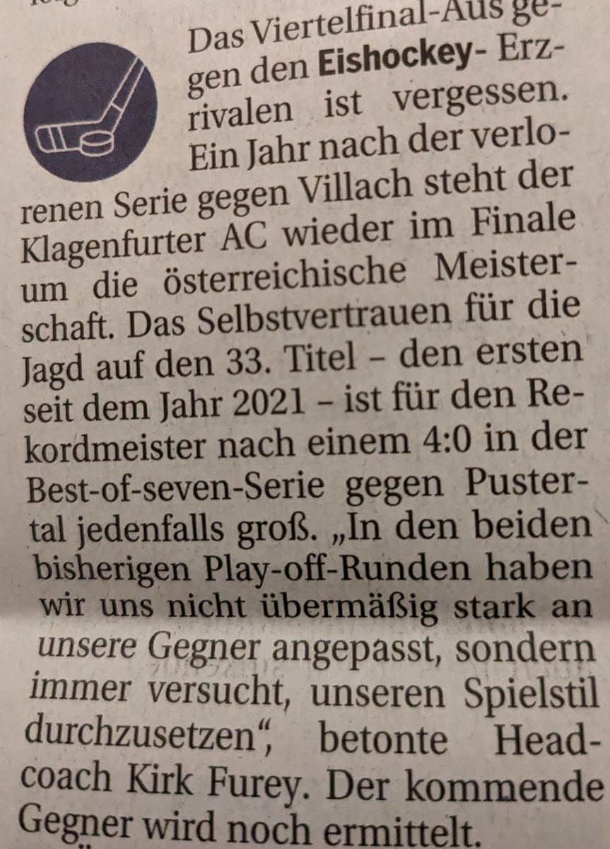 Ich empfehle dir die sportliche Leistung (die ich so nebenbei als Top einschätze) zu honorieren und von der (durchaus verständlichen Antipathie) Abneigung der KLZ unter Quendler zu unterscheiden weil was kann der KAC dafür dass die Berichterstattung zumeist einseitig ausfällt.?