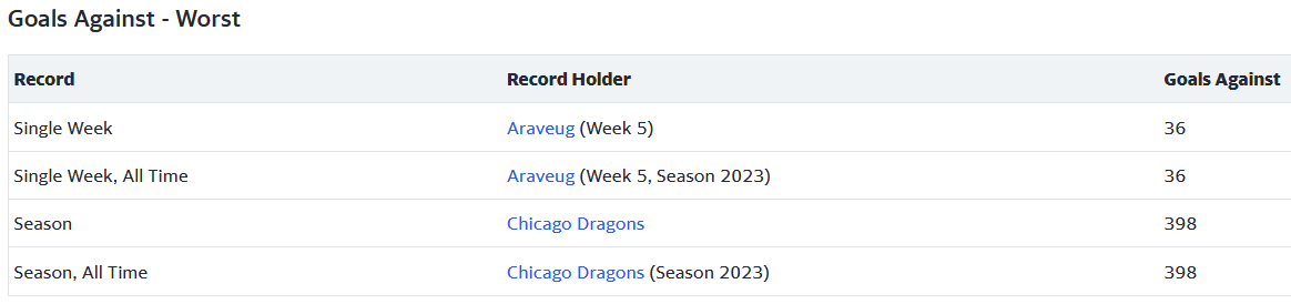 Hab jetzt noch einmal nachgesehen Patman und die Woche 5 von titus flavius - chuckw rausgesucht, er hatte einen Win, also kannst dir die schlechteste Goaliewoche aller Zeiten wohl auf deine Fahnen heften! :D GAA und SV% sprechen auch klar für dich! Was mit (2nd time this season) da oben bei den Records gemeint is, ist mir allerdings nicht ganz klar.