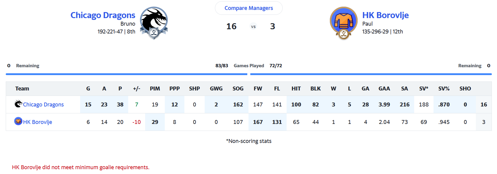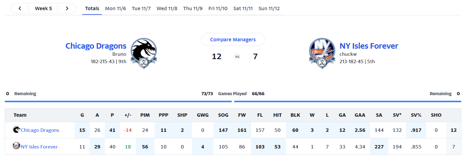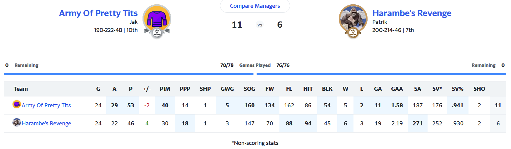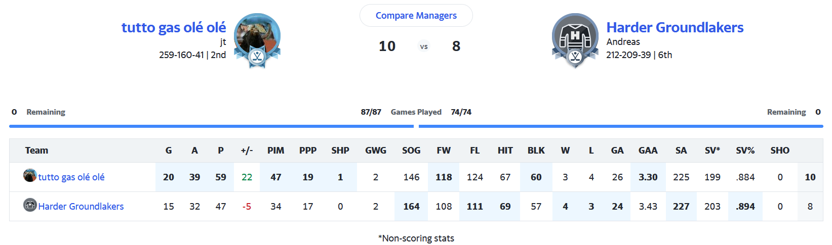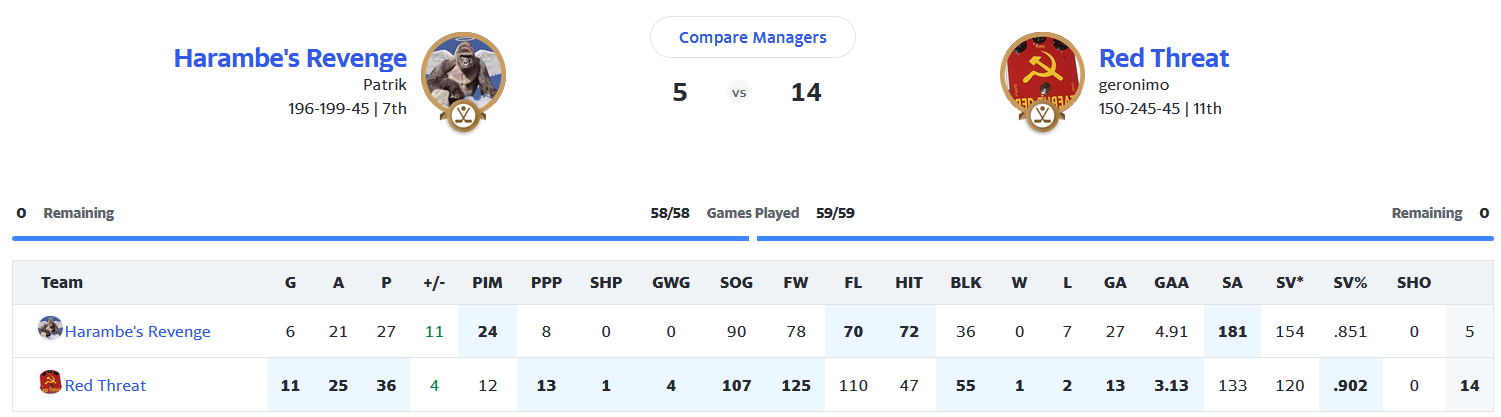 Besonders klug hab ich ja nicht gemanaged, nach dem Fiasko von Vegas im letzten Spiel hätt ich eigentlich keinen Goalie mehr aufstellen sollen, dann wären die Losses und die GA bei mir gewesen, und ich hätt weniger schwitzen müssen.