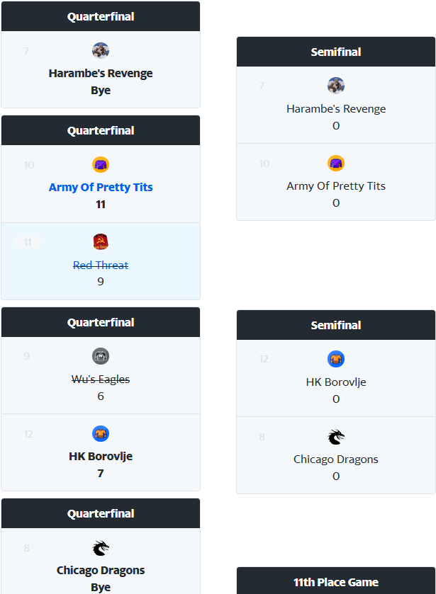 In der Consolation dürfte die Luft beim Duell der 12. und 9. Platzierten schon ziemlich draußen gewesen sein, unser Stefan1403 befindet sich wohl schon im Sommermodus, seine Wu´s Eagles haben gegen den abgeschlagenen Letzten des Grunddurchgangs, die sich nach dem dramatischen hinwegscheiden ihres Managers im freien Fall befindliche Truppe des HK Borovlje, die Chance auf eine wesentliche Verbesserung im nächstjährigen Draft relativ einfach aus der Hand gegeben. Die Konkurrenz wird es freuen, namentlich in erster Linie einmal eest und seine Chicago Dragons, die jetzt im Halbfinale wohl ein "Freilos" serviert bekommen haben.