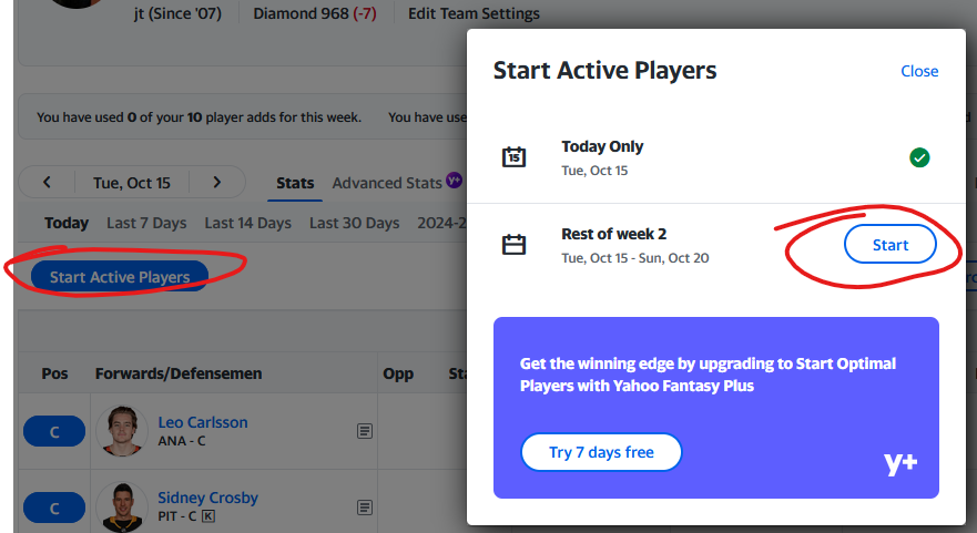 Ich habe jetzt kurz Zugang und meine Starter für die zweite Woche aktiviert, aber tatsächliche Team- und Goaliepflege kann ich erst ab Samstag Abend durchführen.