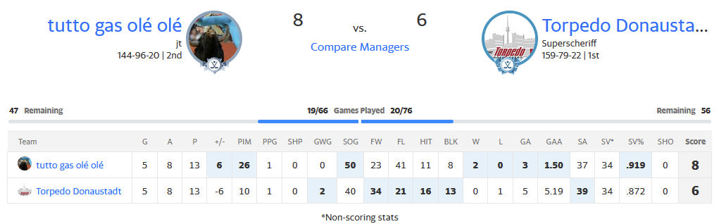 Zum Einen natürlich absolute TOP Leistungen meiner Leute, die es ermöglichen vorerst auch offensiv mitzuhalten. Und natürlich sehr gute Goalie Ergebnisse für mich bisher. :)