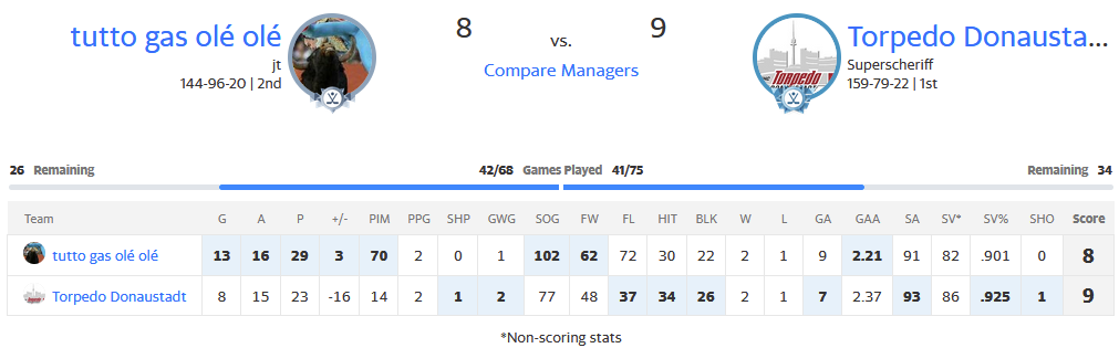 Entschieden wirds wohl wie so oft über die Goalies. Wins und SA wird schwierig gegen dich zu holen sein, SO jetz auch auf deiner Seite, zusammen mit Hits und Blocks, die ich mit meiner Misere bei den D wohl abhaken kann, wird sich das sehr schwierig gestalten, aber schauma mal.