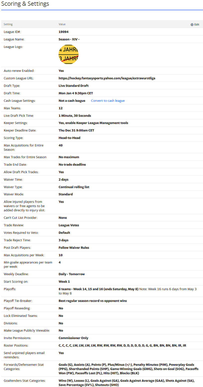 Bzw. sollte es mehrere Interessenten geben könnte man natürlich auch über eine Expansion auf 14 Teams nachdenken, dies müsste aber wirklich ernsthaft und längerfristig sein, da damit einiges an organisatorischem Aufwand verbunden wäre und wieder eine Abwurfmodalität gefunden werden müsste. Ein bisserl frischer Wind würde aber sicherlich nicht schaden, wie siehts bei DieblaueRapunzl aus, du bist ja auch recht engagiert was Fantasy Hockey angeht? Was meinen die arrivierten Manager dazu?