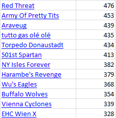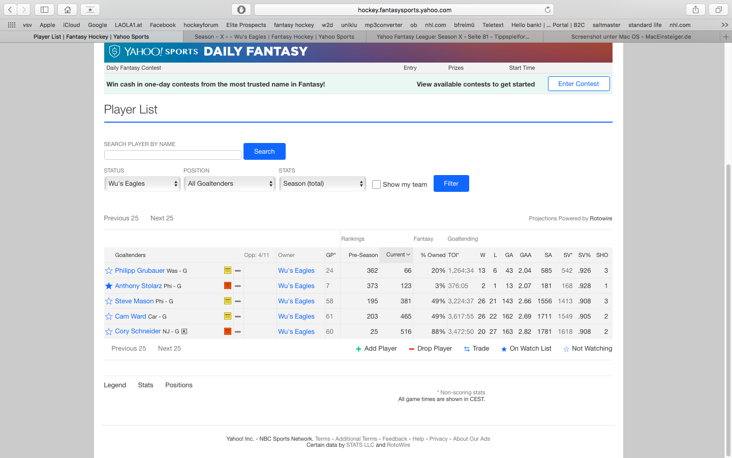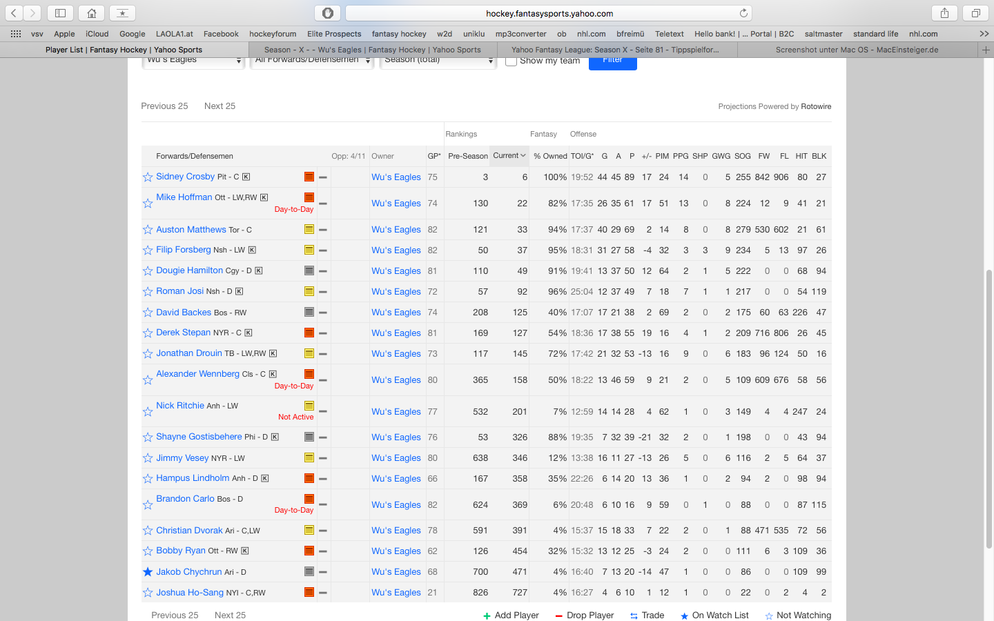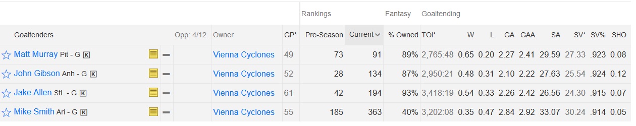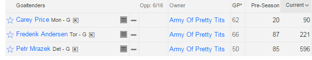 Am Ende wurde es Platz 4. Damit bin ich eigentlich sehr zufrieden, leider hats im Tor heuer doch deutliche Schwächen gegeben. Price spielt keine Traumsaison, bei Andersen ist durch in nächster Zeit stärkere Leafs Luft nach oben. Mrazek leidet sehr unter der schwachen Detroit defense.