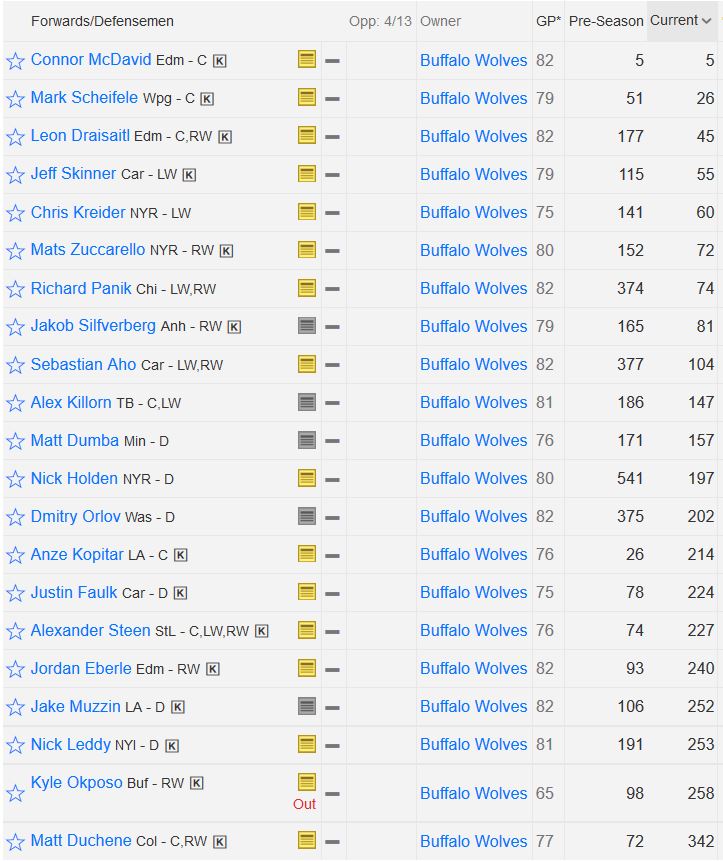 • Abwurfregel: Vor jedem Draft muss aus jedem Kader mindestens ein Spieler, der im finalen Vorjahresranking (Players->CURRENT) unter den besten 15 des jeweiligen Teams die Saison abschloss, abgeworfen werden. Dies inkludiert Torhüter, also bitte auch auf Goaltenders umstellen und diese mit berücksichtigen!