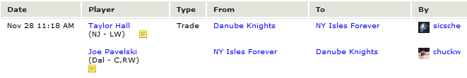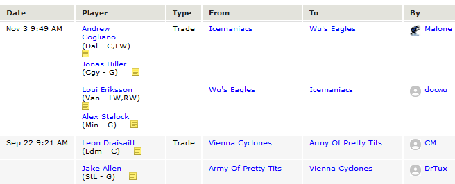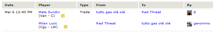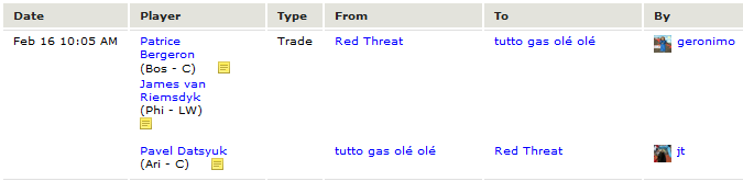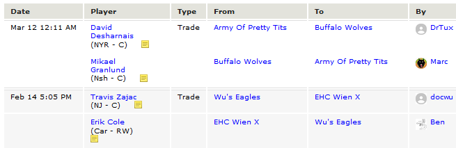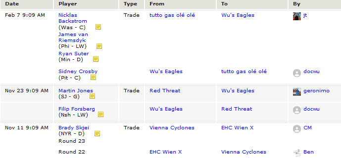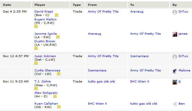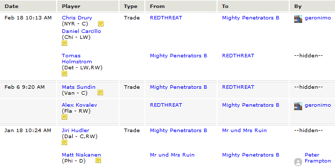 Als Spezialist für die heißen Trades kristallisiert sich ein bisschen unser 127.0.0.1 heraus, 2011 Krejci+Malkin für den Senior Iginla+Brown kann vielleicht nicht unbedingt als Win bezeichnet werden.