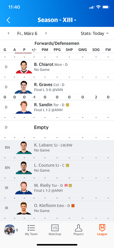 Ich hatte die letzten Wochen immer 7 Verteidiger im Kader, jetzt habe ich nach dem Sandin-Drop noch immer 6 im Kader (davon sind 2 noch IR aber aktuell active). Wie kommst du auf 4 wenn ich fragen darf? Du kannst ja meine Moves nachvollziehen und dann wirst du sehen, dass es IMMER 6 bzw. eben die letzten Wochen sogar 7 waren.