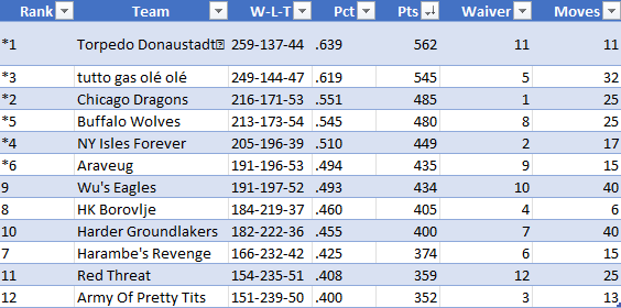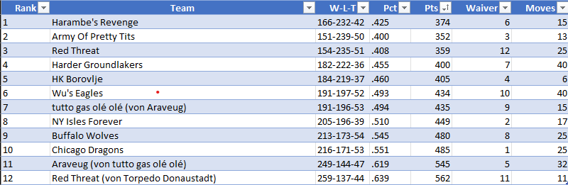 Ich war nie drauf aus irgendwelche hohen Draft Positionen zu erreichen, sondern hatte zu Saisonende die Lust auf Fantasy einfach verloren, nach so vielen Jahren kann das mal vorkommen.