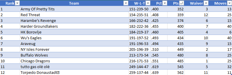 Auf Tux bin ich angfressen, in der letzten Woche mit wieder mal zu wenigen Goalie Starts den letzten Platz klar zu machen, während Eiskalt Nedeljkovich und Ingram holt. Nachdem wir eh schon die ganze Saison darüber lamentieren. Die Toleranz ist jedenfalls ziemlich ausgereizt.