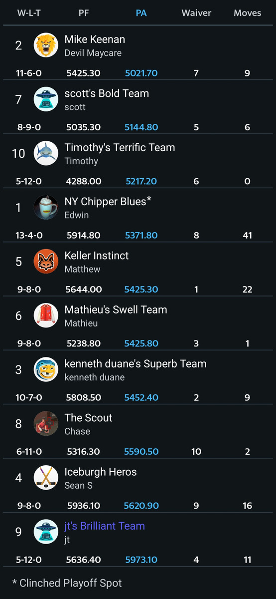 Jetzt ist es sogar bis Platz 1 schon wieder recht gut zusammengerückt. Die Jungs aus Anaheim (das sennecke SO einschlägt, hab ich auch nicht gedacht) und Detroit rocken es heftigst, dazu ein Wilson, der unglaublich spielt seitdem ich ihn habe :D. Da fällts noch nichtmal ins Gewicht, dass ein Matthews eine, für ihn bisher, eher schwache Saison hinlegt.