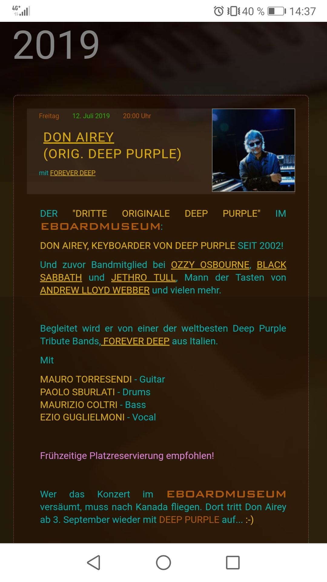 Bleibt alles eher verwirrend und kryptisch für mich. Der ganze Artikel ist etwas sonderbar; dort steht ja auch dass Airey nach dem Tod von Lord im Jahr 2012 dessen Erbe antrat. Keine Ahnung, was damit gemeint ist; bei DP hat Don Airey Jon Lord jedenfalls schon Jahre vor dessen Tod als Keyboarder abgelöst.