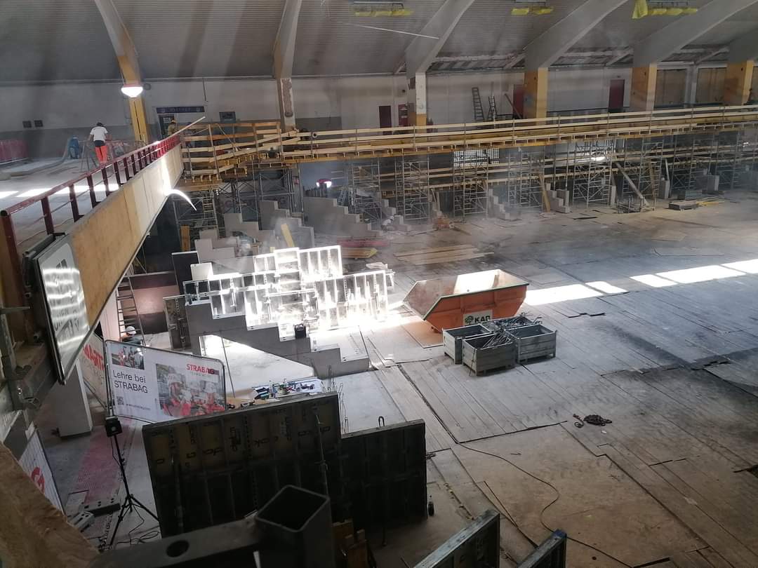 Eine Wohltat endlich verschwindet dieses grausliche Pustertalgelb :) von den Säulen und Trägern, die Betonstufen für die Tribünen stehen auch schon, auch wenn es leider keine neue Neubauvariante ist, freue ich mich trotzdem auf die neue Halle