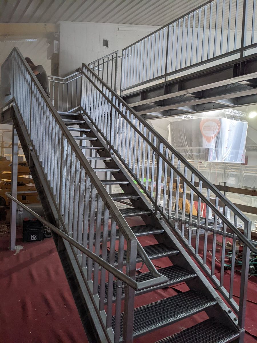 Auf einer Längsseite im Obergeschoss führen Metalltreppen zu einer darüberliegenden Etage, wofür sind diese Plattformen gedacht, für Kameras und Kommentatoren?