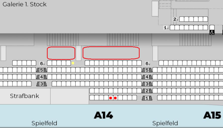 Aber an der eigentlichen Problematik ändert das nur wenig. Ich frage mich, wie hier (rot markierte Bereiche) 48 Steher untergebracht werden sollen. Sollten die reservierten Steher (im Ticketing sind sie separat geführt) nicht in den normalen Stehern enthalten sein, würde sich die Zahl sogar auf 65 erhöhen.