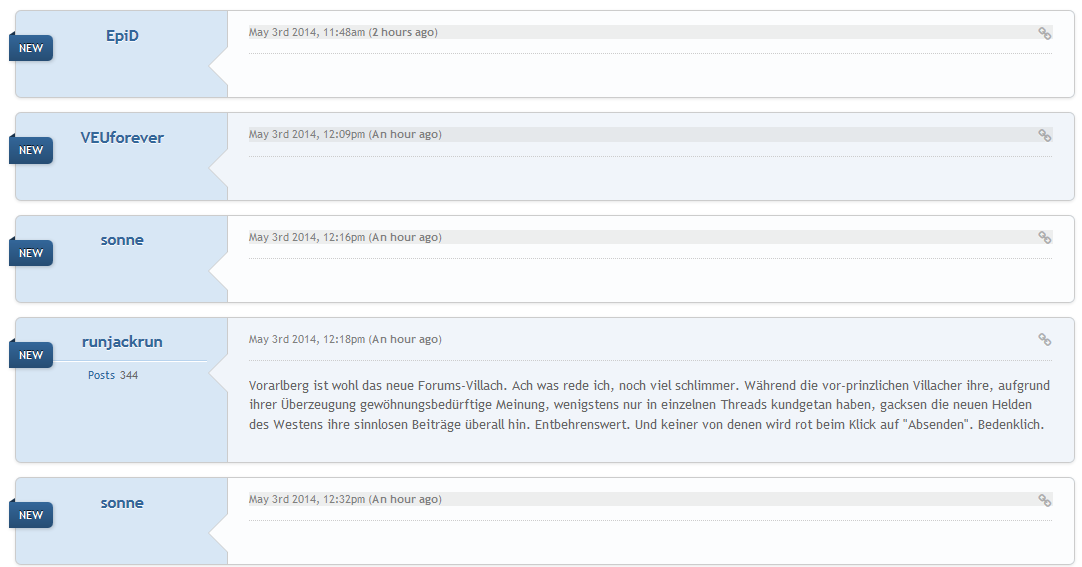 Vorarlberg ist wohl das neue Forums-Villach. Ach was rede ich, noch viel schlimmer. Während die vor-prinzlichen Villacher ihre, aufgrund ihrer Überzeugung gewöhnungsbedürftige Meinung, wenigstens nur in einzelnen Threads kundgetan haben, gacksen die neuen Helden des Westens ihre sinnlosen Beiträge überall hin. Entbehrenswert. Und keiner von denen wird rot beim Klick auf "Absenden". Bedenklich.