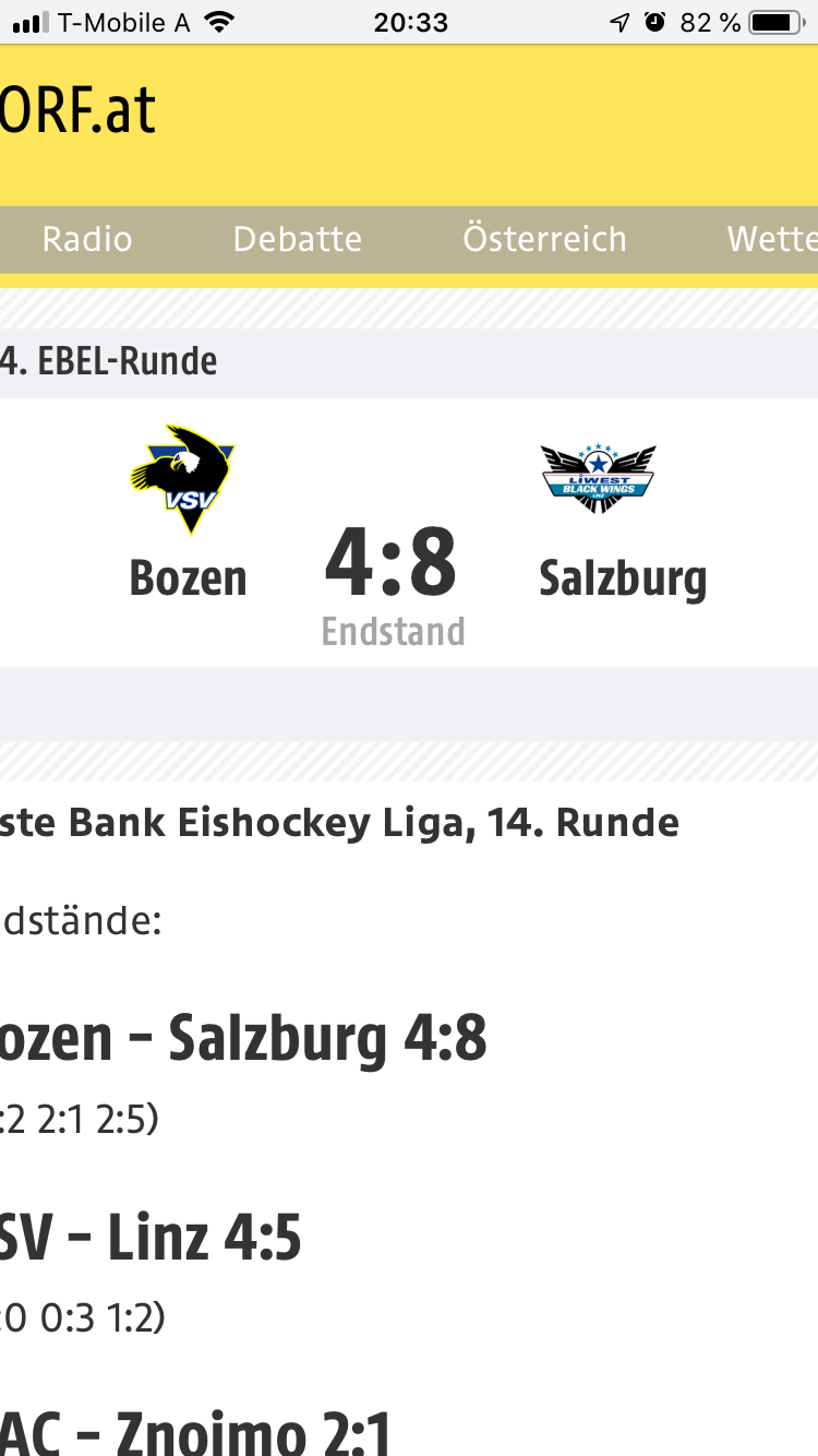Im ZiB Kurzsport um 19:55 Uhr auf ORF 1 habe ich in den letzten 3-4 Jahren, wenn überhaupt mal über eine EBEL Partie berichtet wird, ausschließlich Berichte über Spiele der Capitals gesehen.