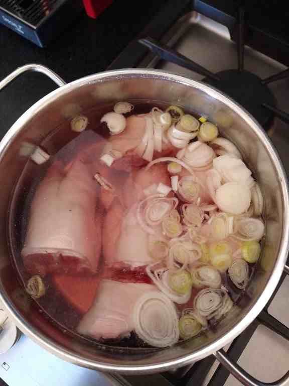 Auf dem Foto der Beginn des "Projekts Patscha", eine bulgarische Suppe aus Schweinefüßen und mit dem gekochten Fleisch dieser hierzulande wenig geschätzten Teile (Großteil wird nach China exportiert), ergänzt mit schaumig gerührter Eigelb-Joghurt-Mischung.