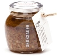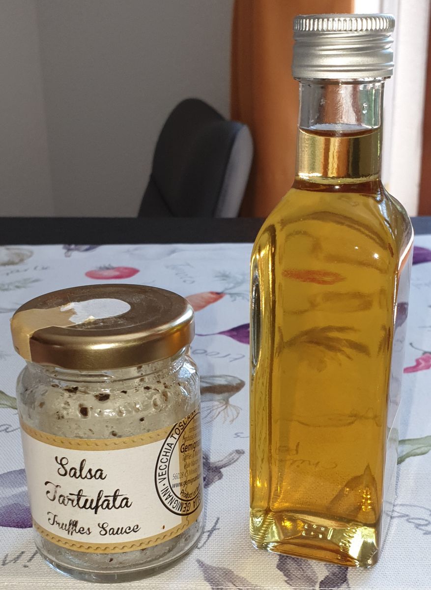 Trüffelöl aus dem Hause 'vom Fass' (Basis hierfür ist natives Olivenöl) und die Salsa als Mehranteil mit Sonnenblumenöl. Darin sind auch Champignons und schwarze Oliven.