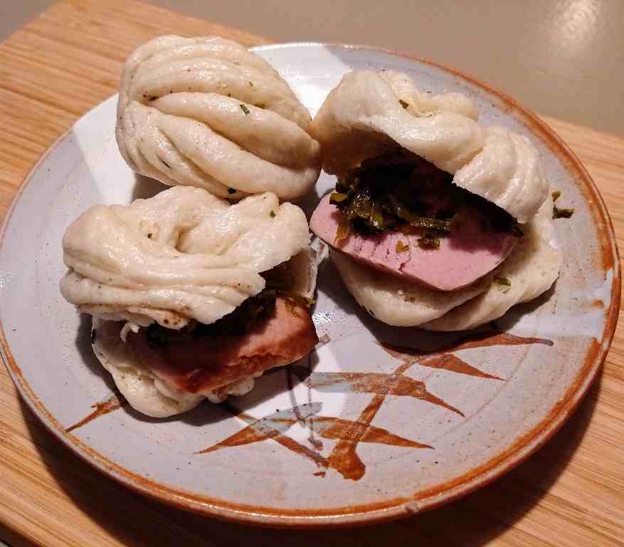 Geschmacklich 1a. Gedämpfte Gaos (Germteig verfeinert mit Schnittlauch und frisch gerösteten Sechuan-Pfeffer) und Leberkaaas belegt mit saurem Senfgemüse mit Chili.