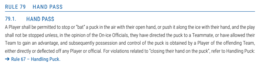 Ehrlich gesagt denke ich auch, dass hier eine Lücke zwischen dem Wortlaut des Reglements und dessen Auslegung besteht. Streng nach Text von IIHF-Regel 79.1 dürfte nur eine Puckberührung mit der "offenen Hand" abgepfiffen werden.