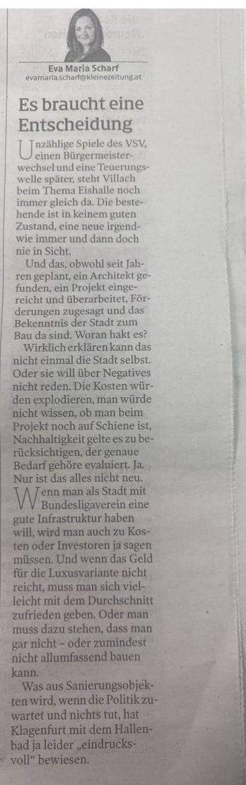 Naja das Thema neue Halle gibt es doch schon einige Jahre und nun sollen auf einmal die Bürger befragt werden? Ist ja schön, dass VE sich ihre Gedanken macht, sind halt nur eine leise Minderheit im Stadtrat die jetzt der Mehrheit wieder ihre Meinung aufdrücken wollen? Für die Entwicklung von Villach als Eishockey Standort kann es imho keine zwei Meinungen geben.