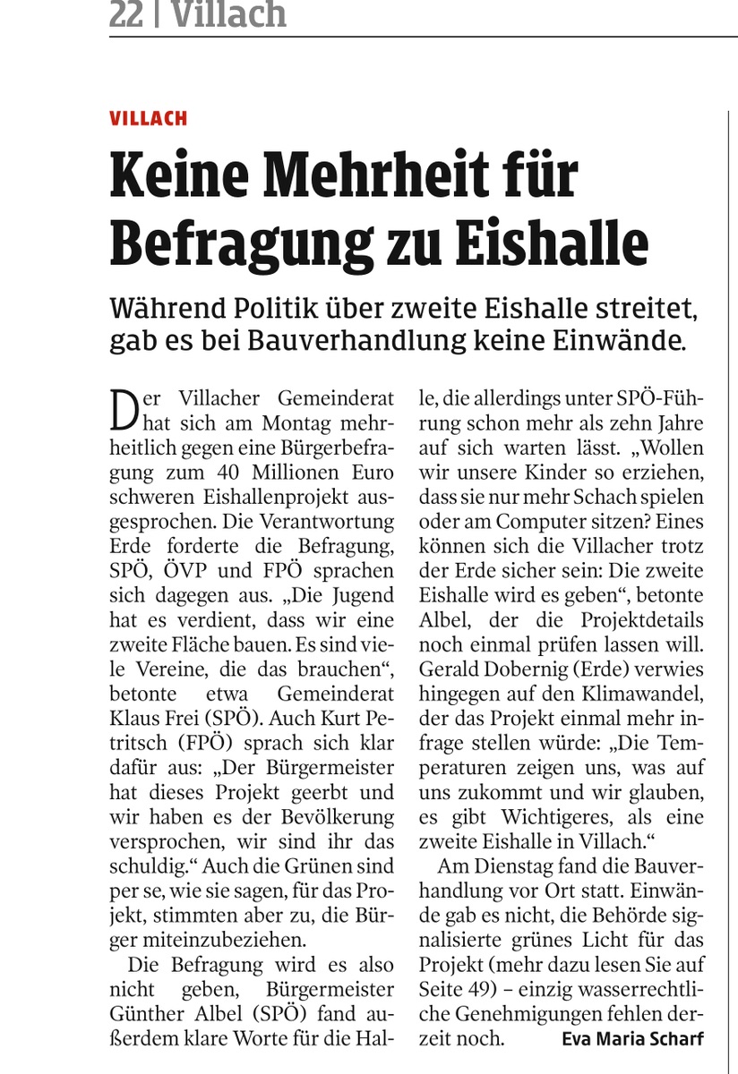 Naja das Thema neue Halle gibt es doch schon einige Jahre und nun sollen auf einmal die Bürger befragt werden? Ist ja schön, dass VE sich ihre Gedanken macht, sind halt nur eine leise Minderheit im Stadtrat die jetzt der Mehrheit wieder ihre Meinung aufdrücken wollen? Für die Entwicklung von Villach als Eishockey Standort kann es imho keine zwei Meinungen geben.
