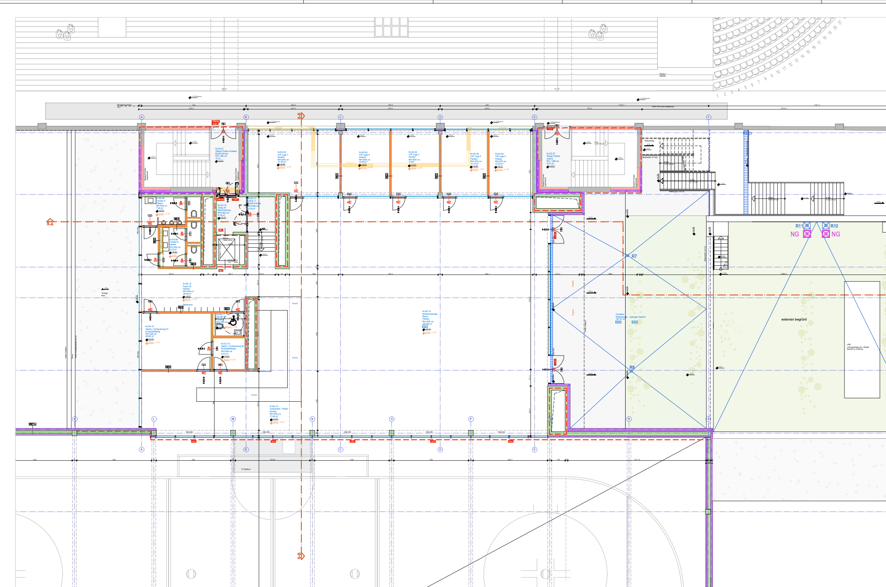 5 VIP Loungen mit rd 17m2 auf der Südseite hinter der alten Steherwand. Dahinter über dem Mittelstück zwischen alter und neuer Halle ein 320m2 Saal mit Theke, Küche & Sanitär. Ich bin gespannt ob man von dort vl. auch in die Trainingshalle reinsieht, würde sich anbieten denke ich.