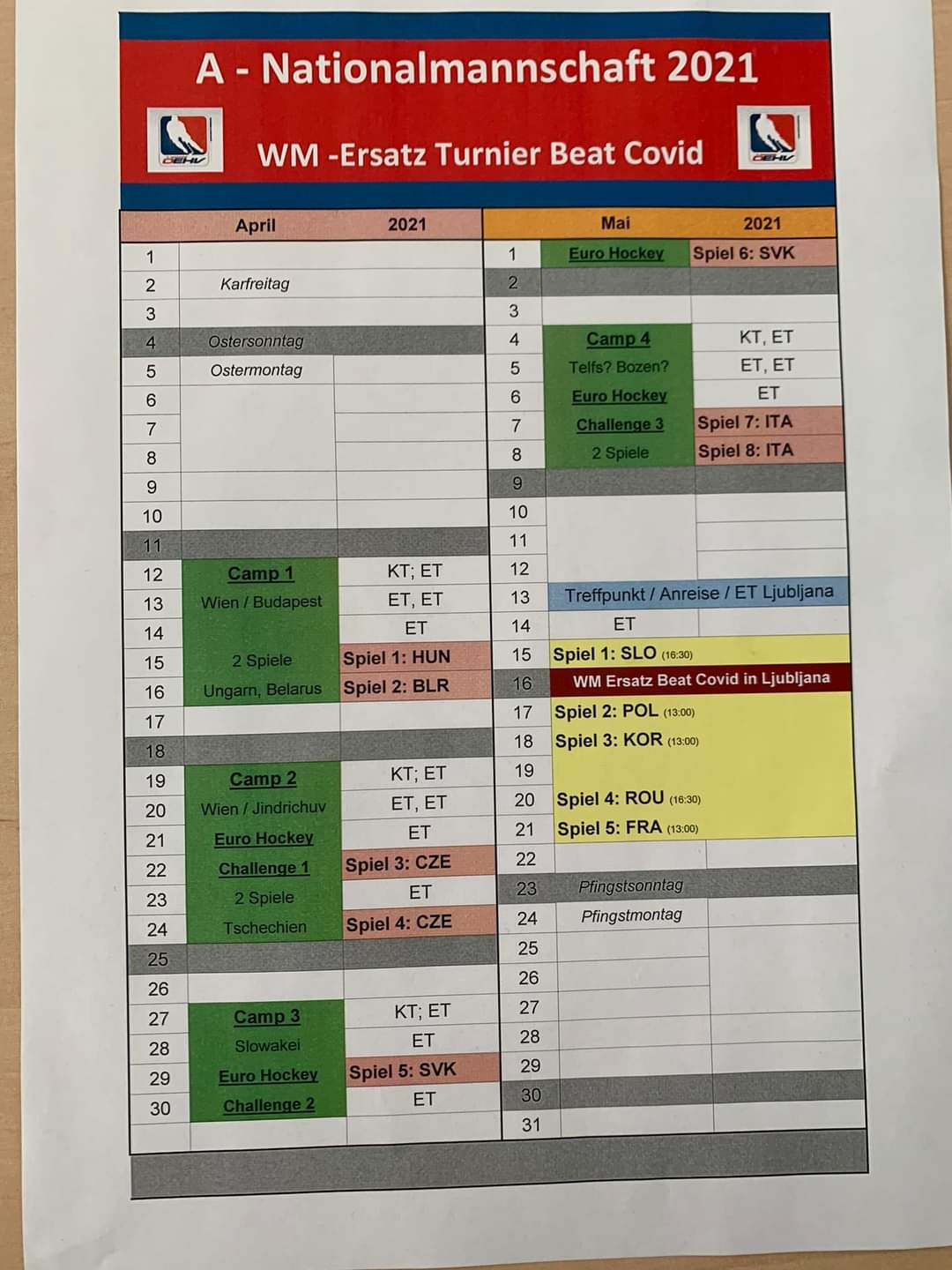 Der Österreichische Eishockeyverband hat sich aus „medizinischer, gesundheits- und sozialpolitischer Sicht“ entschieden, die für November geplanten Lehrgänge der A-Nationalmannschaft (Vier-Nationen-Turnier in Slowenien) und der U18-Nationalmannschaft (Trainingslager in Klagenfurt) der Herren abzusagen.