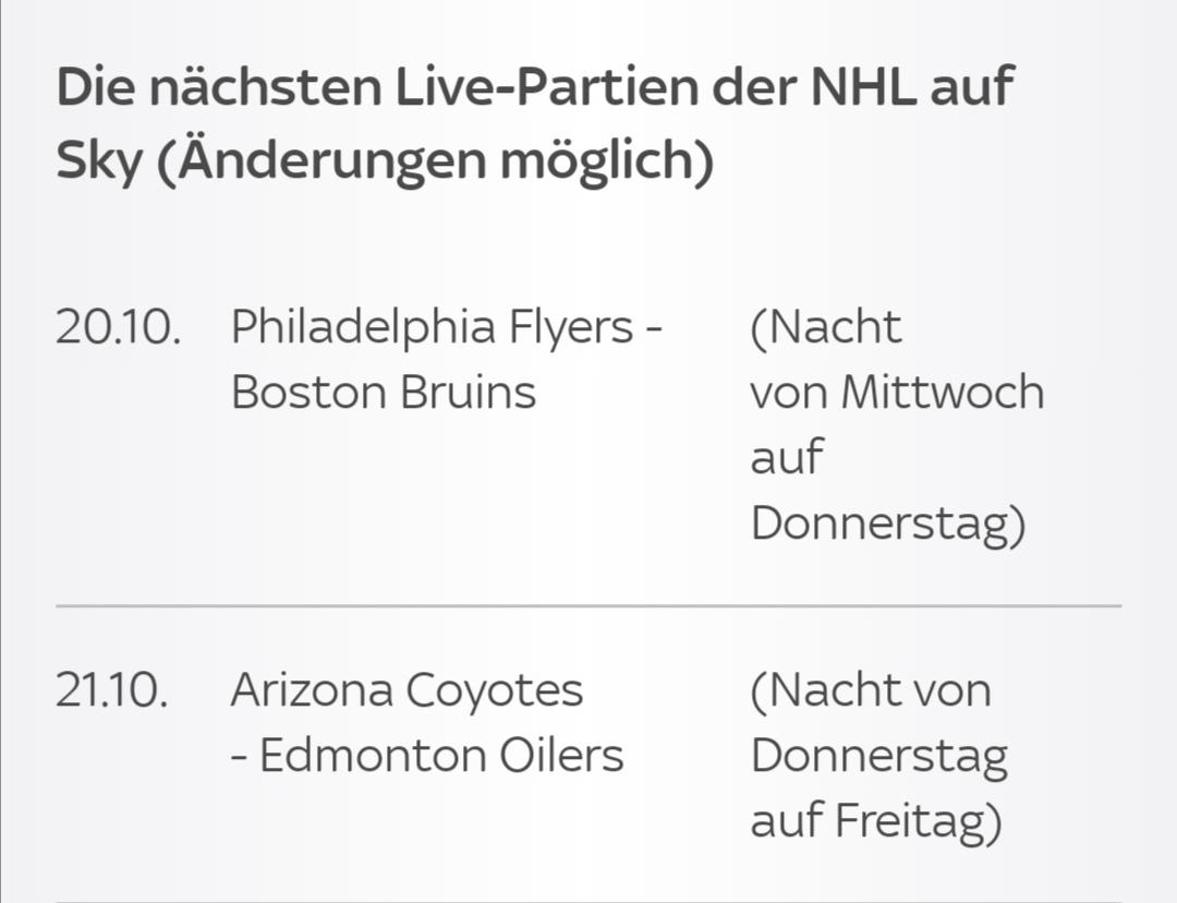 Dass der Deal mit Sky eine Verschlechterung für uns NHL.tv-Kunden darstellt ist unumstritten. Gleich drei der nächsten vier Bostonspiele sind vom Blackout betroffen. Echt nervig.