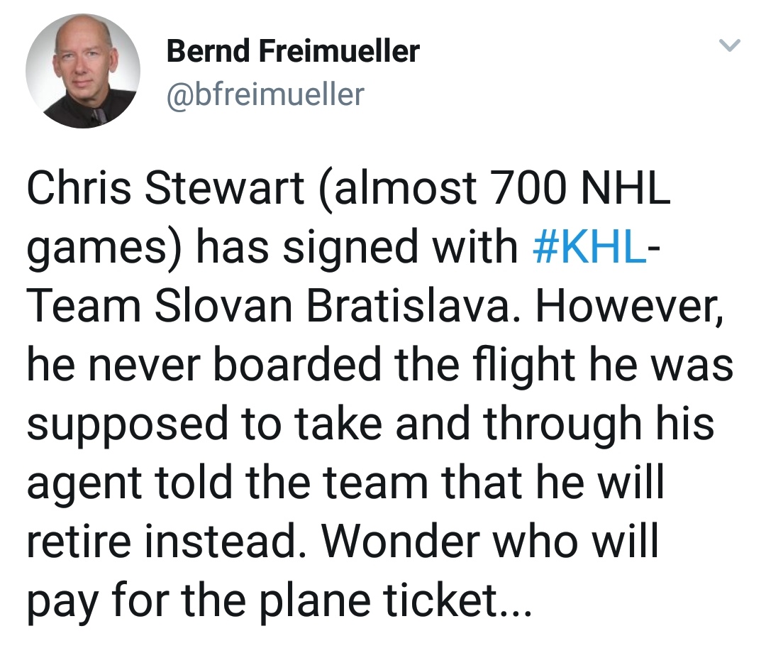 Nachdem Slovan einen Goalie sucht (100000 USD Lohn für eine Saison) und nun auch Stewart nicht kommt sollte Geld ja für Neuzugänge da sein.