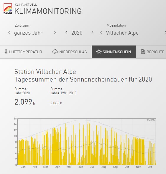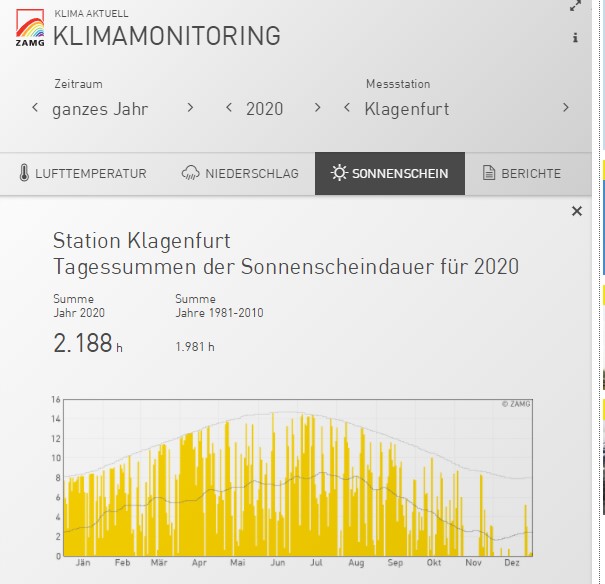 Seit April gibt es in KLafu eine neue innerstädtische Wetterstation der Zamg. Diese weißt m e h r Sonnenstunden und höhere Temperaturen auf als die Station in Villach aus. Die Station am Flughafen in Klafu registriert ca. so viel Sonnenstunden wie in Villach.