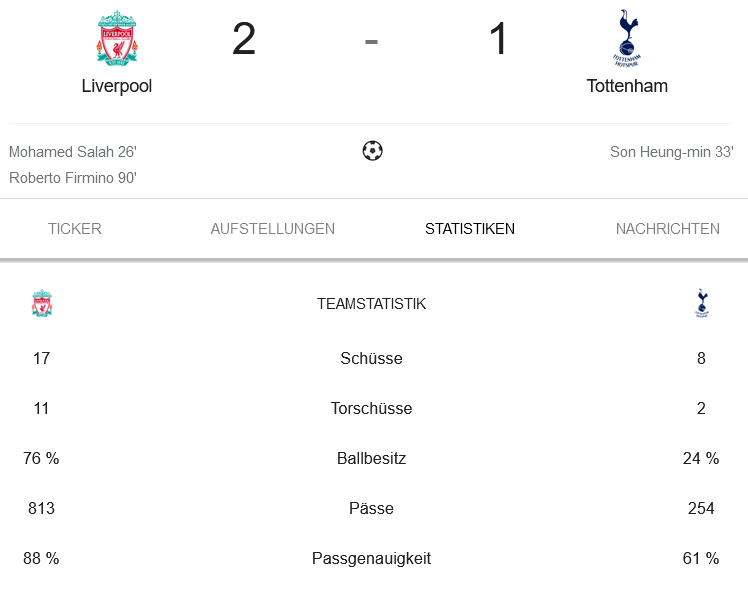 80:20 ballbesitzt, liverpool fahrlässig mit den chancen. den fab 3 fehtl im moment die selbstverständlichkeit.