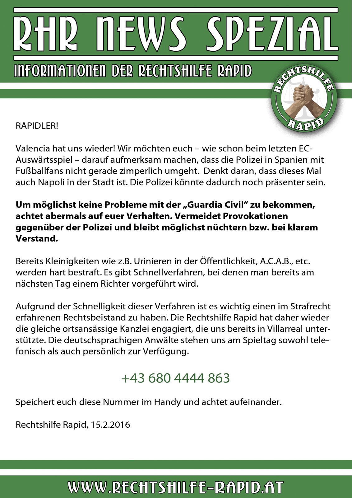 Die Rechtshilfe gibt es, weil Rapid-Fans in der Vergangenheit des öfteren mit dem Gesetz in Konflikt geraten sind. Das es Fans gibt, die Probleme machen, ist die eine Sache, aber das es diese Rechtshilfe gibt, finde ich nicht schlecht. Wer zum Fußball geht und seine Mannschaft auch regelmäßig zu Auswärtsspielen begleitet, der weiß, dass man auch schnell mal als Unschuldiger Probleme mit der Justiz bekommen kann. Natürlich vorausgesetzt, man geht nicht auf den Sitzplatz oder in den VIP-Bereich. -