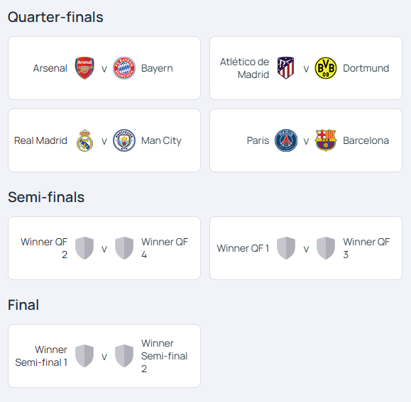 madrid vs city is eigentlich das vorgezogene finale. bei arsenal und bayern seh ich keinen favoriten, die nehmen sich nichts. genauso wie bei atletico und dem bvb