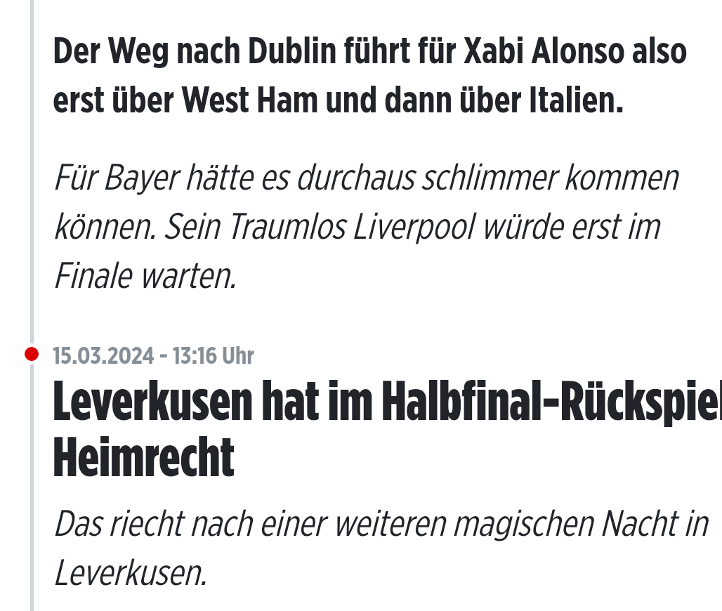 Deswegen lieben wir die Nachbarn so. Leverkusen, das gerade die schwere Hürde Quarabag Agdam souverän und mit einem gütigen Referee überwunden hat, HAT im Semifinalrückspiel das Heimrecht.