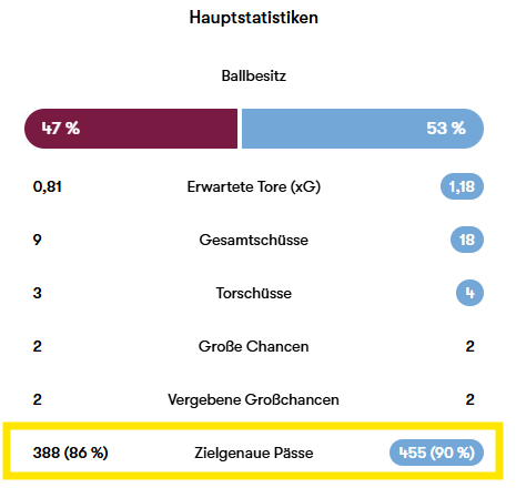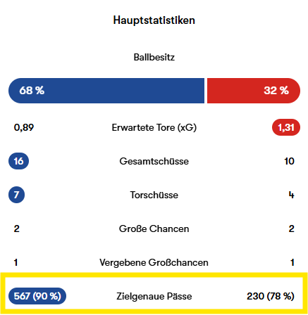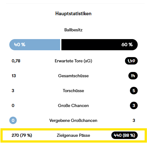 Außerdem geht es auch um die Passquote bzw gespielte pässe, hab ich auch angeführt in dem damaligen Post, sogar hauptsächlich ging es mir darum, was in diesen Fällen auch gegen mich spricht aber, so wie ich kurz geschaut habe , bei den anderen 8 spielen 6x für mich spricht. Danke, setzen ![]()