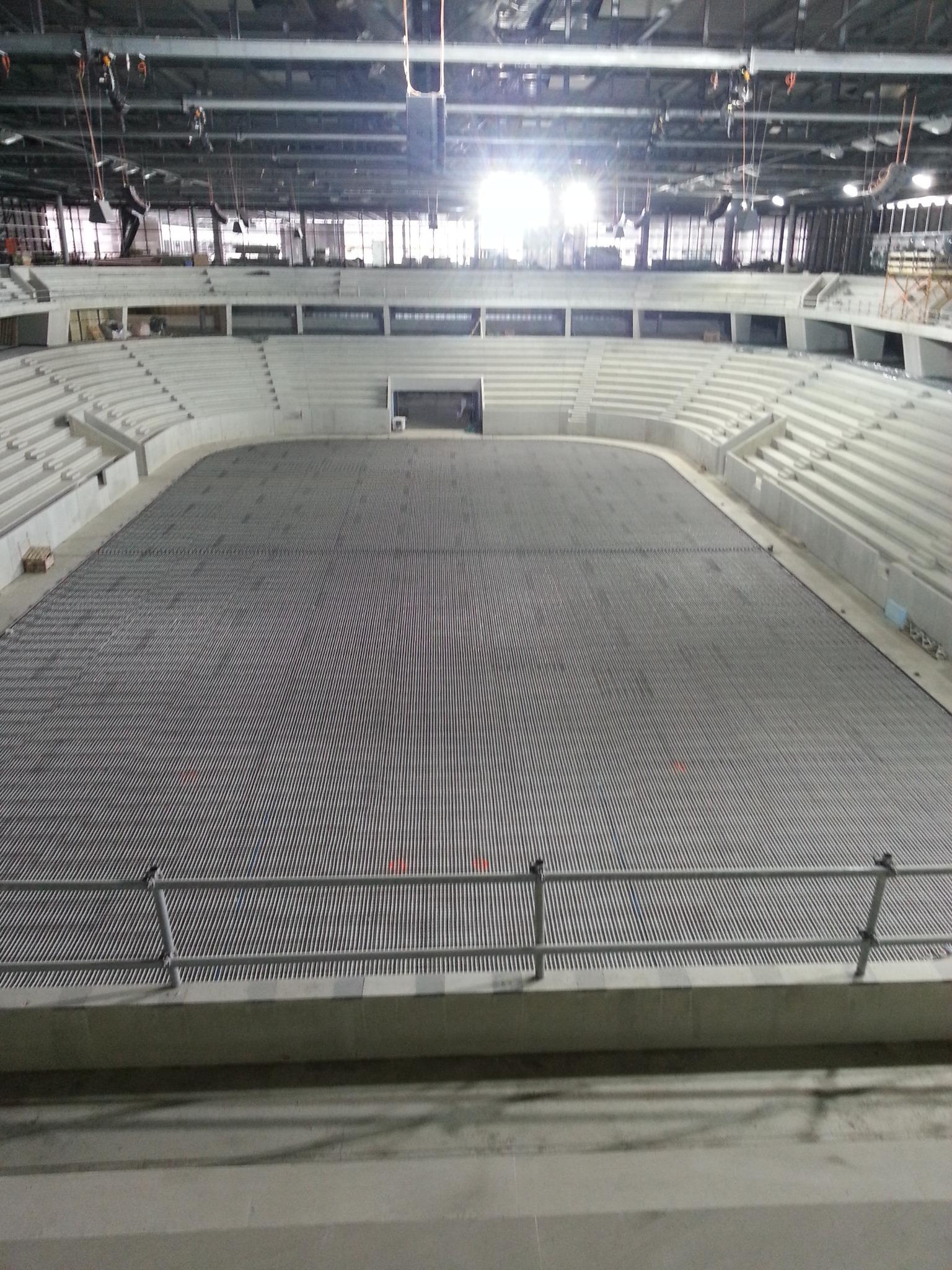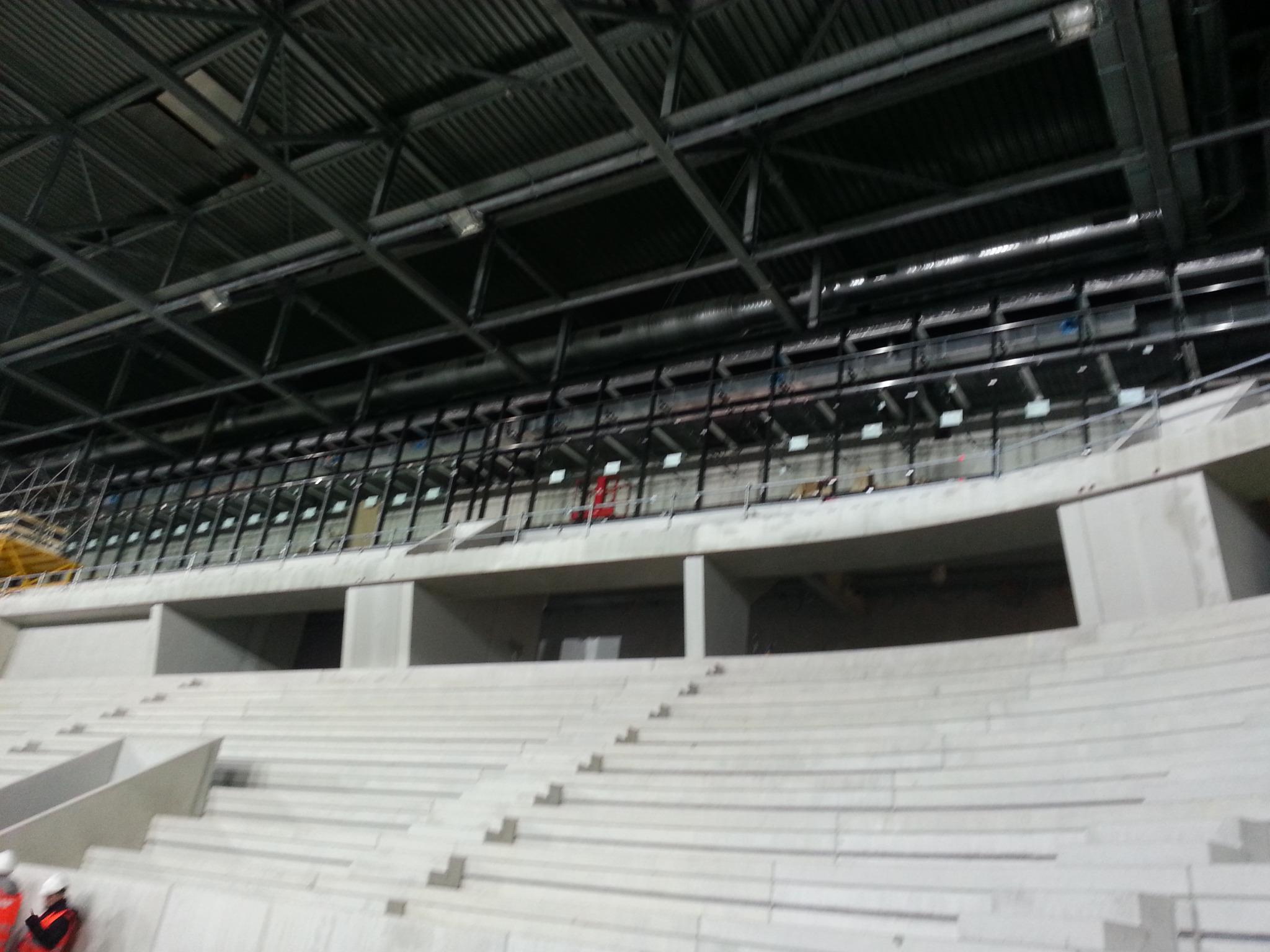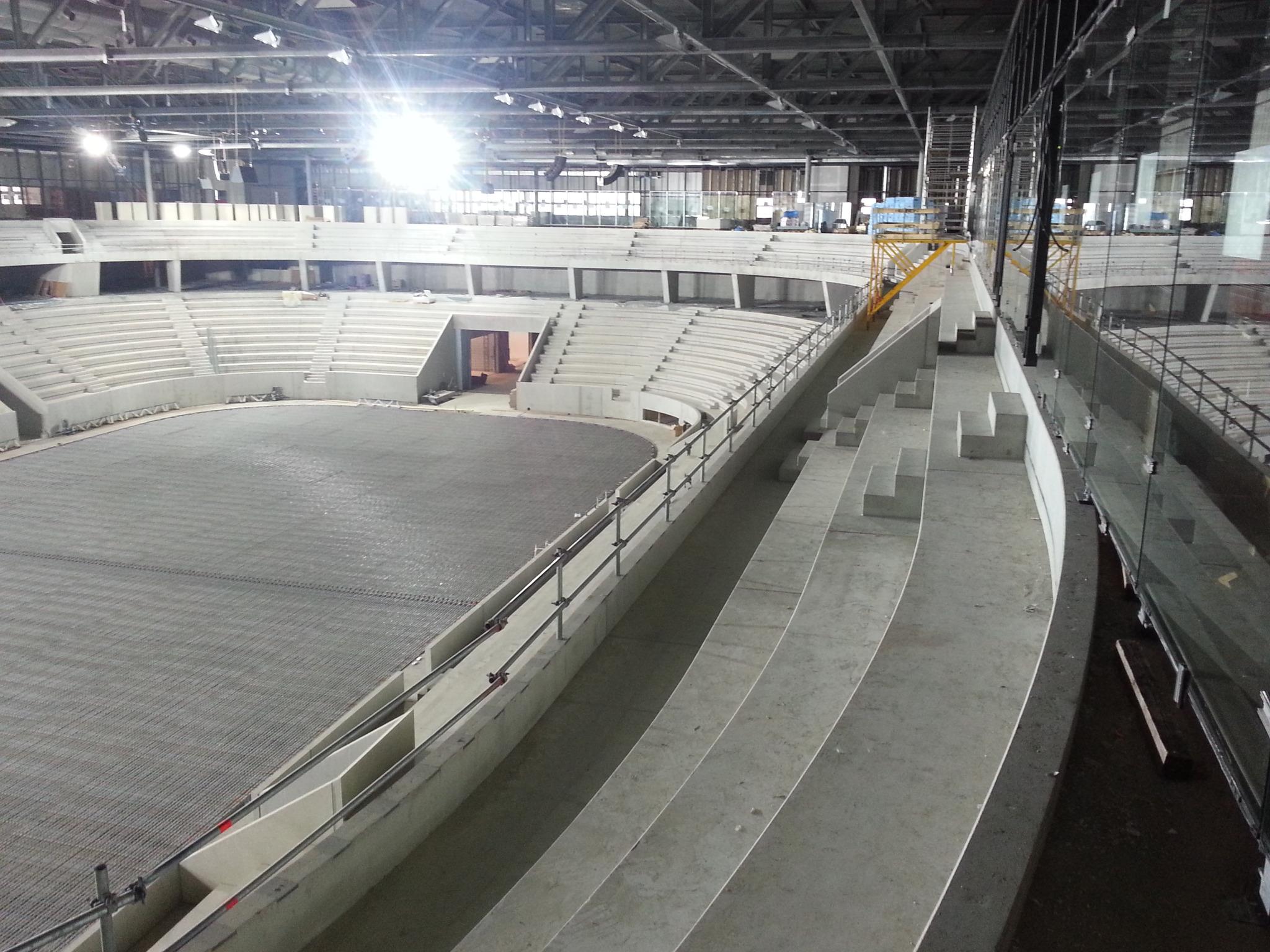 Das Eisstadion ist im Moment voll mit Gerüsten. Statt Eis gibt es derzeit nur Beton weit und breit. Als Besonderheit hat das Eisstadion keine Ecken, wie die Verantwortlichen sagen. Homologiert wurde es für 7000 Plätze, am Ende dürften es wohl 6500 geben.