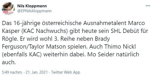 Laut heutiger Kleiner Zeitung steht Marco Kasper im 16 Jahren (!) vor einem SHL-Debüt für Rögle, weil die viele Verletzte haben. Ich kann mir das ehrlich gesagt nicht vorstellen, dass er da wirklich Eiszeit bekommt, aber wenn, wäre das schon sensationell. :thumbup: