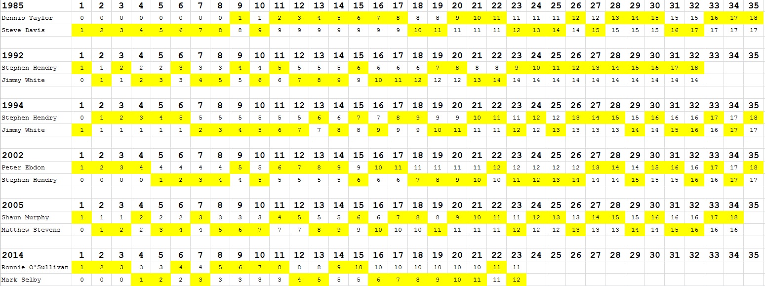 Ähm. Langsam muss man sich wirklich Sorgen machen, dass Ronnie das nicht gewinnt :| Bis jetzt war's ja nett, ein bisschen Spannung reinzubringen - aber jetzt wird's wirklich wirklich knapp. Pfuh. Ich hab nicht mit einem spannenden Finale gerechnet ...