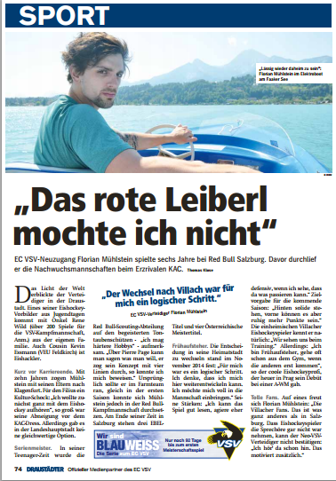 Auf eines freut sich Florian Mühlstein: „Die Villacher Fans. Das ist was ganz anderes als in Salzburg. Dass Eishockeyspieler die Sprechöre gar nicht war nehmen, kann der Neo-VSVVerteidiger nicht bestätigen:„Ich hör' da schon hin. Das motiviert zusätzlich.“