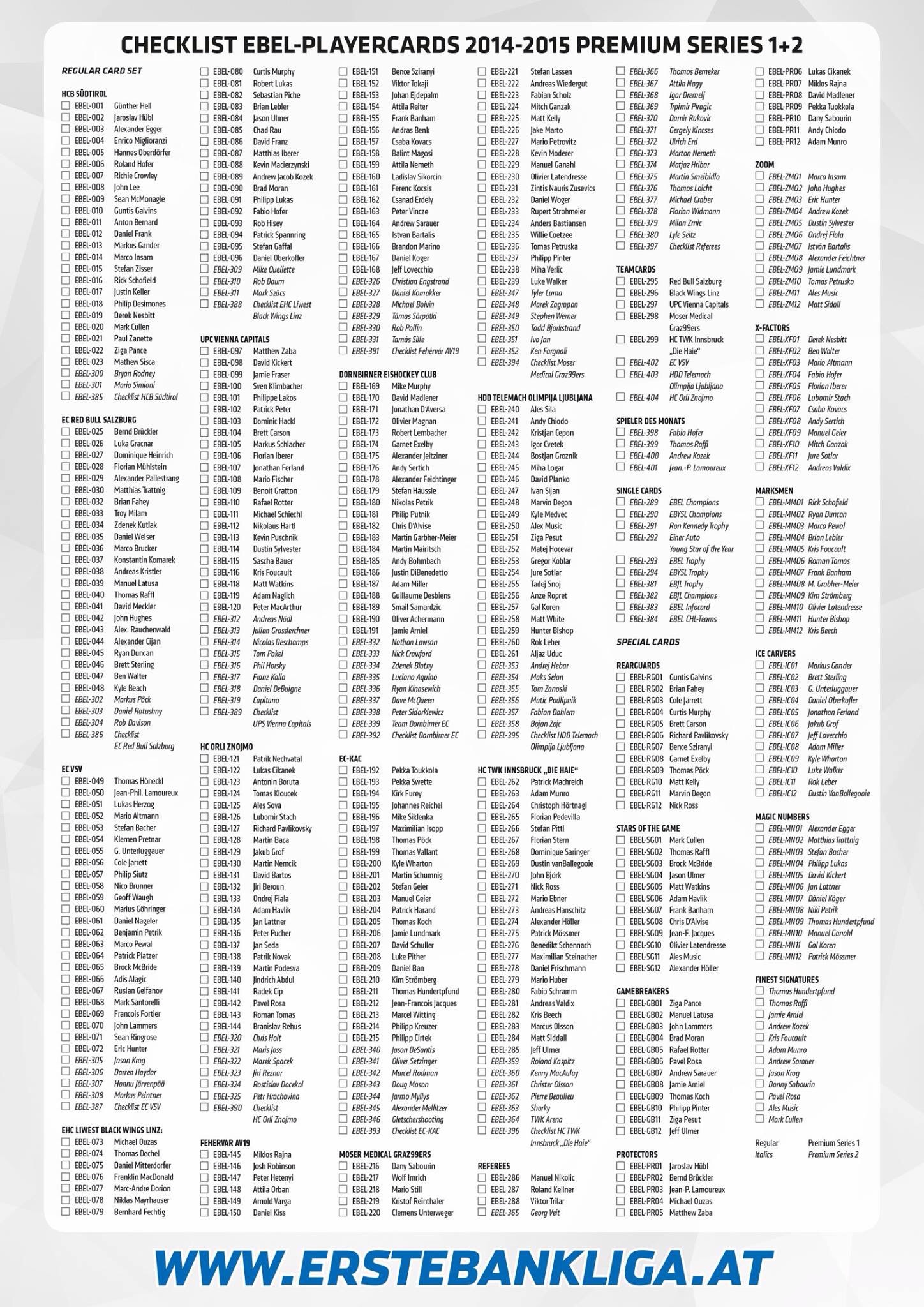 Servus in die Runde. Mal ein paar Hinweise von uns. Wir haben der Liga zwei unterschiedliche Serien, eine preiswerte Einsteiger-Serie für Kinder und Jugendliche sowie die Weiterführung der bisherigen "Konfiguration" in Form der Premium-Serie empfohlen. Unsere Zielstellung ist es mit der Basic-Serie neue, junge Kunden an das Sammelprodukt heranzuführen, die sich bisher noch nicht mit Playercards beschäftigt haben. Auch ist bekannt das es innerhalb der ErstenBank Eihockey Liga stärkere wirtschaftliche Unterschiede zwischen den Teams gibt. Für die "schwächeren" Teams ist die Basic-Serie somit geeigneter als die Premium-Edition. Deshalb müsst ihr bitte die beiden Serie auch etwas getrennt voneinander betrachten. Bei den Checklisten haben wir lange überlegt wie wir diese Aufbauen. Da sich die Serien ja doch voneinander unterscheiden mussten zwei Checklisten erstellt werden, jedoch wollten wir übersichtshalber keine Kartennummern doppelt vergeben. Falls das jetzt zu unübersichtlich ist werden wir das in der kommenden Saison dann vermutlich ändern. Die aktuelle Premium-Serie haben wir auf 200 Normalkarten begrenzt, damit wir für die Premium-Serie 2 dann nicht zu wenig Motive haben. Erinnert Euch an die Update-Serie aus der vergangenen Saison. Hier hatten wir zu wenig Karten und somit (rechnerisch logisch) haben sich immer wieder die gleichen Karten wiederholt. Dem jedoch entgegenzuwirken zu können benötigen wir ein höhere Anzahl an Normalkarten pro Serie. Das ist ja im Interesse der Kunden und wir sind somit auf Eure Kritik aus dem vergangen Jahr eingegangen. Der Fehler auf der Karte SG02 ist mehr als ärgerlich, nur stellen wir rund 3000 Karten pro Saison für unterschiedliche Ligen her und sind da eben auch auf die Unterstützung der Teams angewiesen. Jedes Team muss lediglich ca. 30 Karten kontrollieren und freigeben. Sie sollten ihre Spieler eigentlich kennen und Fehler eher finden als wir es bei uns in der Masse schaffen. Denke aber das kann und wird immer mal passieren, obwohl es sicher für alle ärgerlich ist. Falls ihr ein grössere Anzahl an "gestanzten" (geriffelte) Karten in den Tüten habt, sendet uns bitte eine Information per mail zu und wir werden dann die Karten natürlich ersetzen. Bitte nach Möglichkeit nicht wenn es sich nur um 2-3 Karten handelt da der Austauschaufwand nicht wirklich im Verhältnis zum "Schaden" steht. So ich denke das war es erst einmal, viel Spass beim Sammeln und Tauschen. City-Press